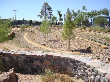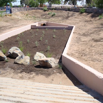 n 2013, a decision was made to rehabilitate the area and re-purpose it into an Arid environment Low Impact Development (ARID LID) demonstration garden with water harvesting elements. The new configuration will provide lower maintenance needs and, after the native plant species are established, no supplemental watering will be required. The native plants will also provide phytoremediation of the street toxins in a similar manner to the original wetlands.